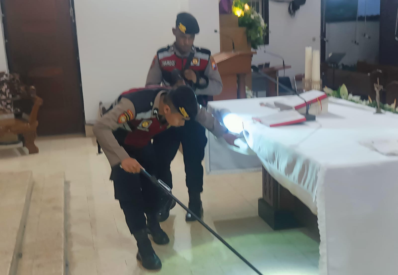 Kegiatan sterilisasi ini dilakukan oleh personel Samapta Polres Blitar Kota Polda Jatim dengan menyisir setiap sudut gereja, mulai dari area altar, bangku jemaat, hingga area parkir dan fasilitas umum lainnya.