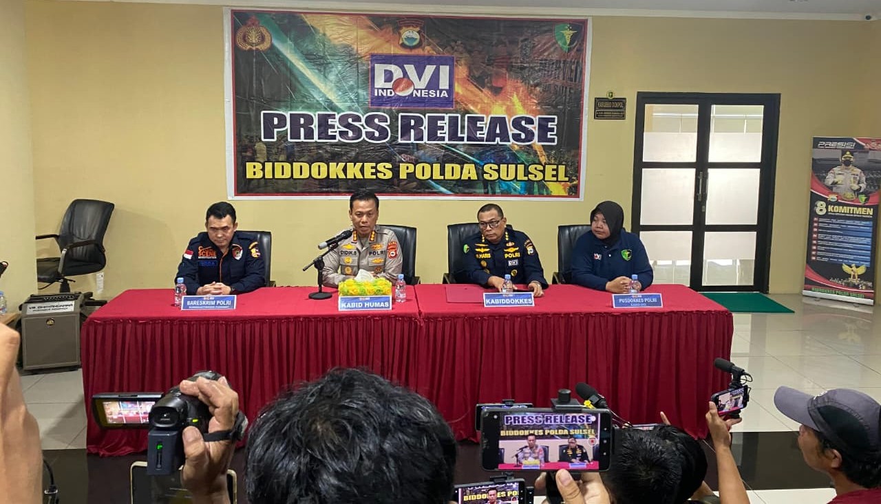 Konferensi Pers tersebut dipimpin langsung oleh Kabid Humas Polda Sulsel Kombes Pol. Didik Supranoto, S.I.K., M.H., didampingi Kabiddokkes Polda Sulsel, perwakilan Pusdokkes Polri selaku Kabid DVI, serta perwakilan Bareskrim Polri melalui Kabiddaktikkrim Pusident.